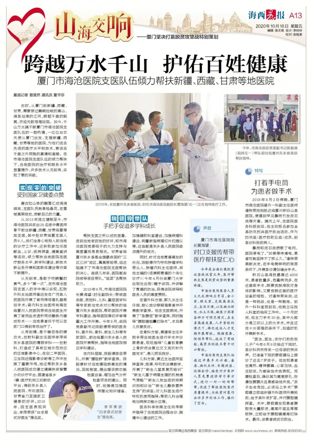 从2013年独立建制至今,市海沧金沙集团 共派出25名老中青医师骨干前往新疆、西藏、甘肃临夏等地支医,其中赴甘肃临夏支医人员6人。
