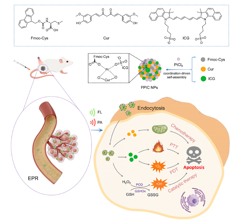 纳米酶作为一种具有天然酶活性的纳米材料,已广泛应用于药物递送,多功能协同靶向治疗肿瘤,是肿瘤治疗的新兴趋势。然而,目前无机纳米酶药物载体仍面临生物安全性欠佳、稳定性不足、肿瘤选择性低等挑战。本研究通过铂驱动的氨基酸、姜黄素和光敏剂吲哚菁绿的配位共组装,制备了一种具有过氧化物酶和谷胱甘肽氧化酶样活性的超分子纳米组装体系,使其催化癌细胞产生毒性氧自由基的效率极大提升,还可以过度消耗癌细胞的谷胱甘肽,削弱癌细胞防御体系。同时,癌细胞靶向定点释放的化疗药物以及光敏剂,在激光作用下实现了光动力/化动力的协同增强肿瘤治疗效果。本研究为设计具有多种酶活性和治疗功能的超分子肿瘤靶向体系提供了新的思路。该工作得到厦门市自然科学基金、国家自然科学基金等项目资助。